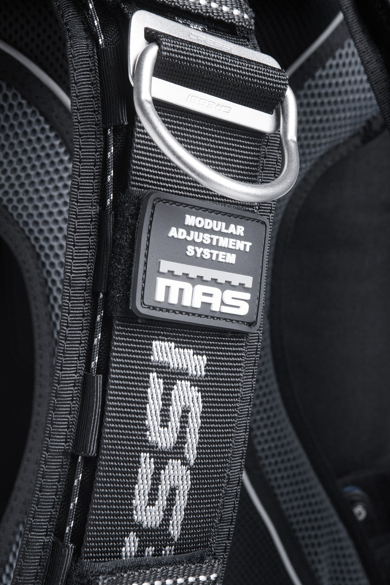 The single 50 mm belt that embraces the shoulders and waist can be quickly adapted to the diver's size. The shape of the air chamber has been designed to ensure perfect buoyancy with a single cylinder. The anodized light alloy backplate reduces the overall weight of the jacket while guaranteeing stability and safety in use. The particular cylinder rest in thermoplastic rubber integrated with the back of the jacket guarantees the positioning of the tank for optimum trim.