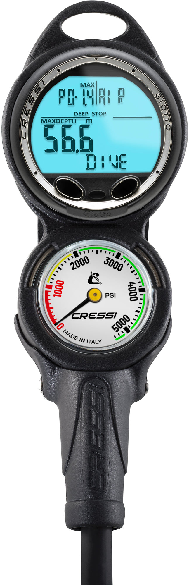 The Giotto Console 2 has been designed to fit the dive computer Giotto in a modern console, which differs in form, size, and weight from similar products on the market. The different sizes of the two instruments, the mini Submersible Pressure Gauge and the Computer, have led to a console design truly innovative and original. The instruments are arranged on slightly tilted, which further improves the design and allows for greater readability of the same. The use of advanced materials, such as polycarbonate and Desmopan, has reduced the thickness and weight to a minimum, and the console reveals a surprising lightness, which obviously translates into ease of use and minimum strain on the hose connection to the first stage HP. Giotto is the first mixed gas dive computer designed-and-built entirely by Cressi. Giotto's 3-button interface makes it effortless to program air, nitrox and gauge modes from the first time a diver picks the computer up. The high-definition screen has large numerical displays in a computer that is still compact-and-travel-friendly. The clearly visible battery life indicator and distinct audible alarms deliver critical information as well as peace-of-mind during the dive. The Giotto can also be fully re-set after each use, making it an excellent choice for rental departments. The computer has an algorithm created through a collaboration between Cressi and Bruce Wienke based on the Haldane Model, integrated with RGBM factors for safe decompression calculations in repetitive multi-day dives and with gas mixtures. The software handles two-different hyper-oxygenated mixtures, which can be selected during the dive. It will provide all the necessary information depth, dive times, possible need of decompression, ascent rate and all the surface intervals between dives. Nitrogen absorption-and-release is continuously processed by its sophisticated software, taking into account the quantity of inert gas contained in the different mixtures that can be used. This information is shown on the device's large display via the PCD (Priority Compartment Digit Display) system that allows an easy-and-direct "dialogue" between the diver and the computer, ensuring a clear- understanding of all the data needed at any given time and a perfect readability in any situation. The Computer is provided with 12/24 hour format clock, calendar and a versatile dive memory (logbook of 70 hours or 60 dives). The Mathematical model of Giotto can make saturation and de-saturation calculations of dives carried out both with air and with nitrox in any moment of the dive. In this last case you can set all the parameters related to the mixture of your dive: from the maximum allowed PO2 value from between 1.2 and 1.6 BAR | 17.4 to 23.2 PSI, to the mixture's oxygen percentage (FO2): between 21% and 99% of O2. Additionally, the device may be set by the user for either metric (m-ºC) or imperial system (ft.- ºF). The mini Submersible Pressure Gauge has a color-coded scale that the divers can read at a glance. The instruments face is divided into three different colored zones: the area from 50 BAR | 600 PSI and below is highlighted-in-red with a slide-bar and red stripes. If the gauge is used on deeper dives, the red scale extends and fades to 100 BAR | 1,300 PSI, this provides for added reserve air indication required at greater depths. From 600 PSI (50 BAR) to approximately 200 BAR | 3,000 PSI is green and from 200 BAR | 3,000 PSI to end of the scale is blue. The front glass lens is made to act as a pressure relief valve. In the event of a sudden increase in pressure inside the instrument, the glass rises slightly, allowing the excess pressure to escape. The instruments are housed in a small, modern shaped console boot, made from polycarbonate and Desmopan, (a thermoplastic polyurethane) two materials that guarantee protection from shocks, scratches and which, at the same time, is very lightweight. The pressure gauge housing is durable chrome plated brass. The gauge boot has an attachment point for a clip or lanyard. The pressure gauge is equipped with a 7/16" threaded high-pressure hose.