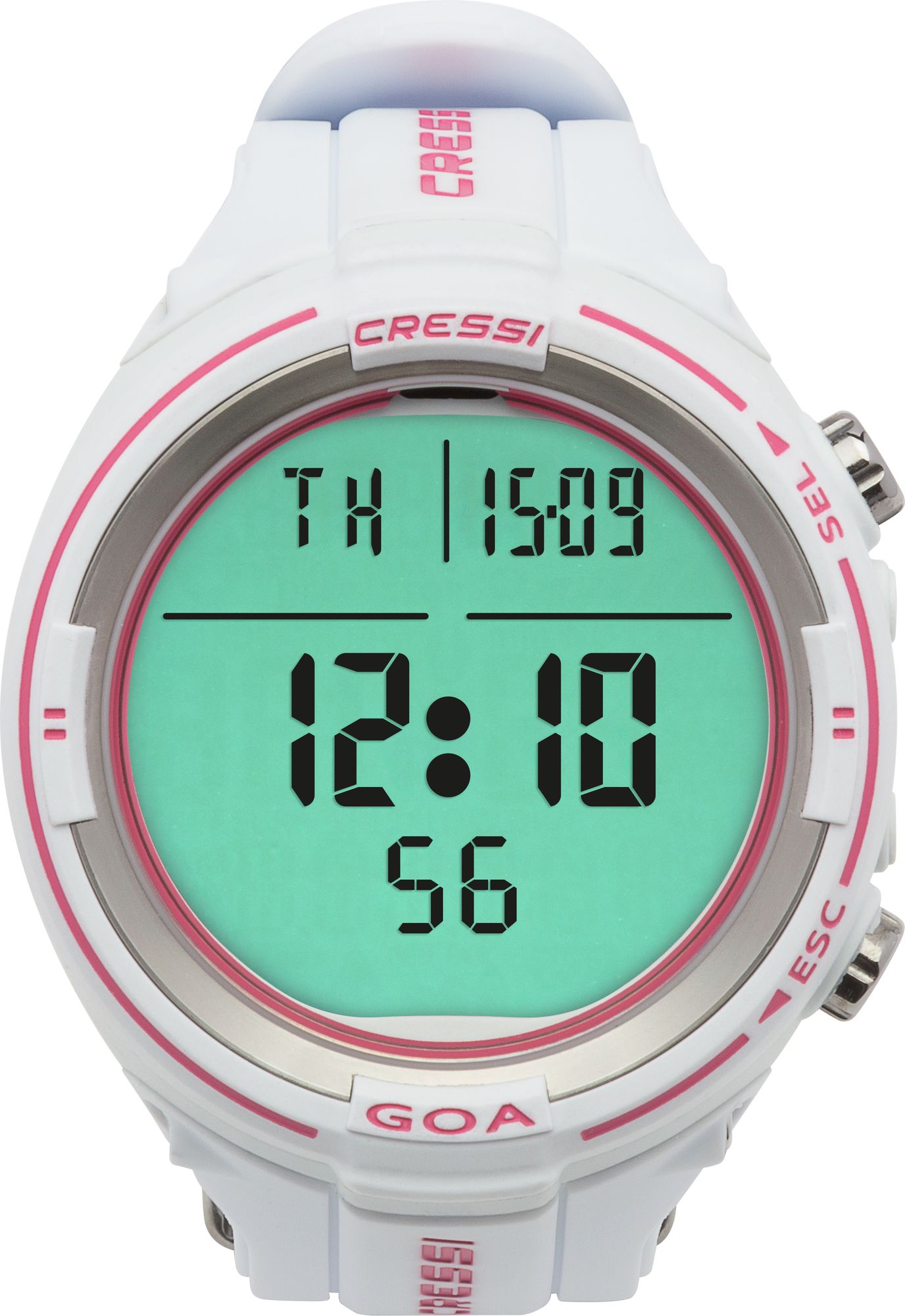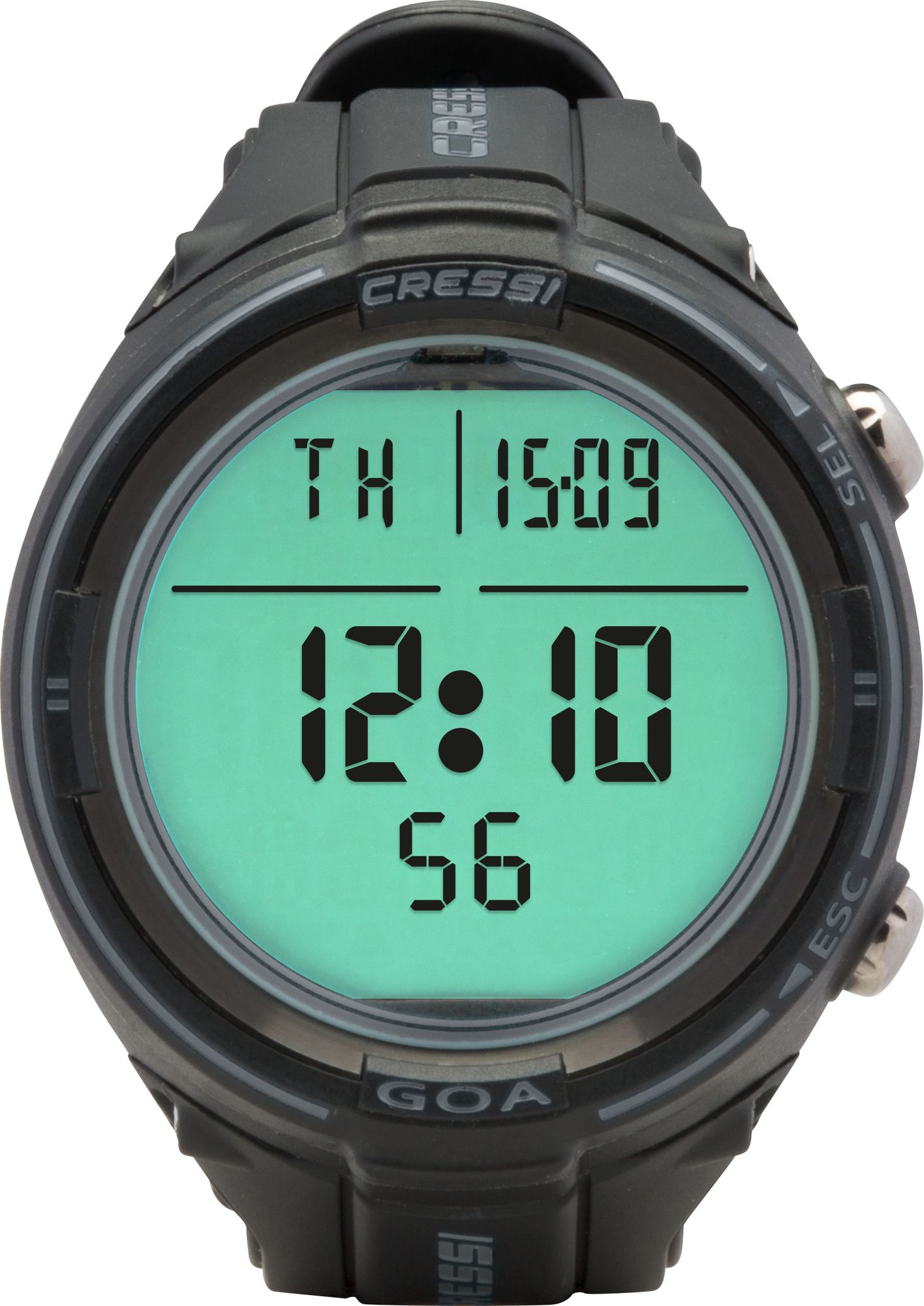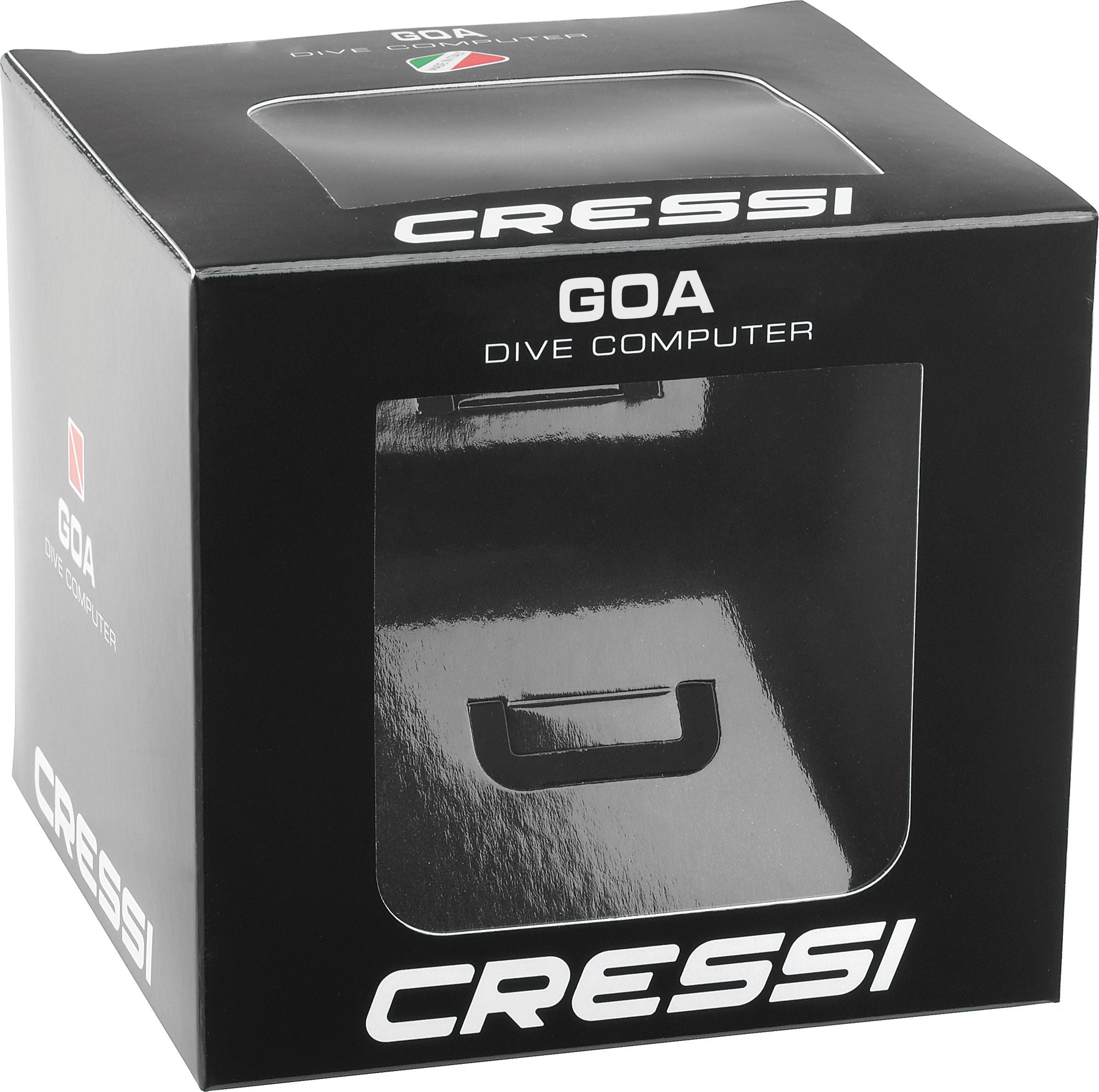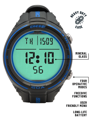 Cressi Elettronica has developed the last generation of dive computer, the Goa, from scratch. It features a new CPU that is faster with greater functionality. The latest motherboard has been completely redesigned, allowing for a larger battery with a long-lasting life. The case has a diameter of only 48 mm | 1 7/8 in and a high contrast display of 35 mm | 1 3/8 in. The computer monitor is made of mineral glass and the case is heavy-duty with steel buttons with an underwater resistance up to 120 m | 393 ft. Plastic/Steel bezel and stainless steel back cover. It has only 2 buttons making the menu easy to navigate. It not only features programs for scuba diving but also has a program for freediving, in which it is possible to customize different alarms. It is also an ideal watch for other underwater activities due to the dive functions' deactivation option that avoids unnecessary alarms while snorkeling or swimming. Data is acquired 4 times faster: every 5 seconds while scuba diving and every 2 seconds while free diving. Additionally, the computer acquires temperature data. The result is a more complete and precise chart that is viewable in the interface software. Through the BT Interface application (sold separately), a user can download and analyze the diving data recorded on the Goa. The connection between the Goa and a smartphone is done using the Interface connected via Bluetooth. The Cressi app, available for Android and iOS, allows users to view charts and data from scuba diving and freediving sessions. It is possible to save a logbook with a memory of 50 dives per category. The records are completed with two graphs, showing the water pressure data (taken every 5 seconds) and water temperature data (taken every 5 seconds). All the information can be uploaded to the DAN (Divers Alert Network).