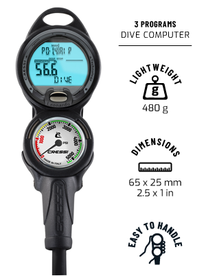 The Leonardo 2.0 Console 2 has been designed to fit the Leonardo scuba dive computer in a modern console, which differs in form, size and weight of similar products on the market. The different sizes of the two instruments, the computer Leonardo and the Pressure Gauge, have led to a console designed truly innovative and original. The instruments are arranged on slightly tilted, which further improves the design and allows for greater readability of the same. The use of advanced materials such as polycarbonate and desmopan, have reduced to a minimum thickness and weight and the console reveals a surprising lightness, which obviously translates into ease of use and minimum strain on the hose connection to the first HP the stadium. The hose connection has a lower section of the standard (11 mm – 0.43 in), to the advantage of its flexibility and lower weight. The Leonardo is designed, developed and produced in Italy by Cressi Elettronica. It is a completely modular, rugged computer with a wide UFDS display, which provides the proverbial ease of navigation and Cressi computer menus. It has complete Nitrox management, depth gauge mode, and a reset option. The algorithm incorporates RGBM and Deep Stop. Menus and navigation system identical to the rest of the Cressi diving computers, with ease of reading, access to information and model parameter modification. Easy configuration, navigation through the various menus and access to a large amount of information displayed intuitively. "User-Friendly Display System". The information display, screen contrast, proportions and digit size have been carefully chosen for ease of use. All of the information presented is separated by light lines to facilitate reading even in stressful or emergency situations. Back-lit display activated by button or when alarm sounds. Extended battery life through a combination of systems: battery saver mode when the computer is not used with automatic power-on. The Submersible Pressure Gauge reads from 0 to 350 BAR | 5000 PSI. For at-a-glance monitoring of air pressure the instrument's face is divided into three different colored zones: the area from 50 BAR | 600 PSI and below is highlighted in red with solid and red stripes. If the gauge is used on deeper dives, the red scale extends and fades to 60 BAR | 1000 PSI, this provides for added reserve air indication required at greater depths. From 50 BAR | 600 PSI to approximately 200 BAR | 3000 PSI the scale is green and from 200 BAR | 3000 PSI to the end of the scale is colored in blue. The device is powered by a long-lasting CR2430 button battery which can be replaced by an authorized Cressi center by verifying perfect watertightness. The BT interface (sold separately) uses infrared to connect to your dive computer and smartphone via Bluetooth. Thanks to the Cressi app, available in the Google Play Store and Apple App Store, it is possible to download the diving sessions and monitor the training. The Cressi app is compatible with Android and iOS.