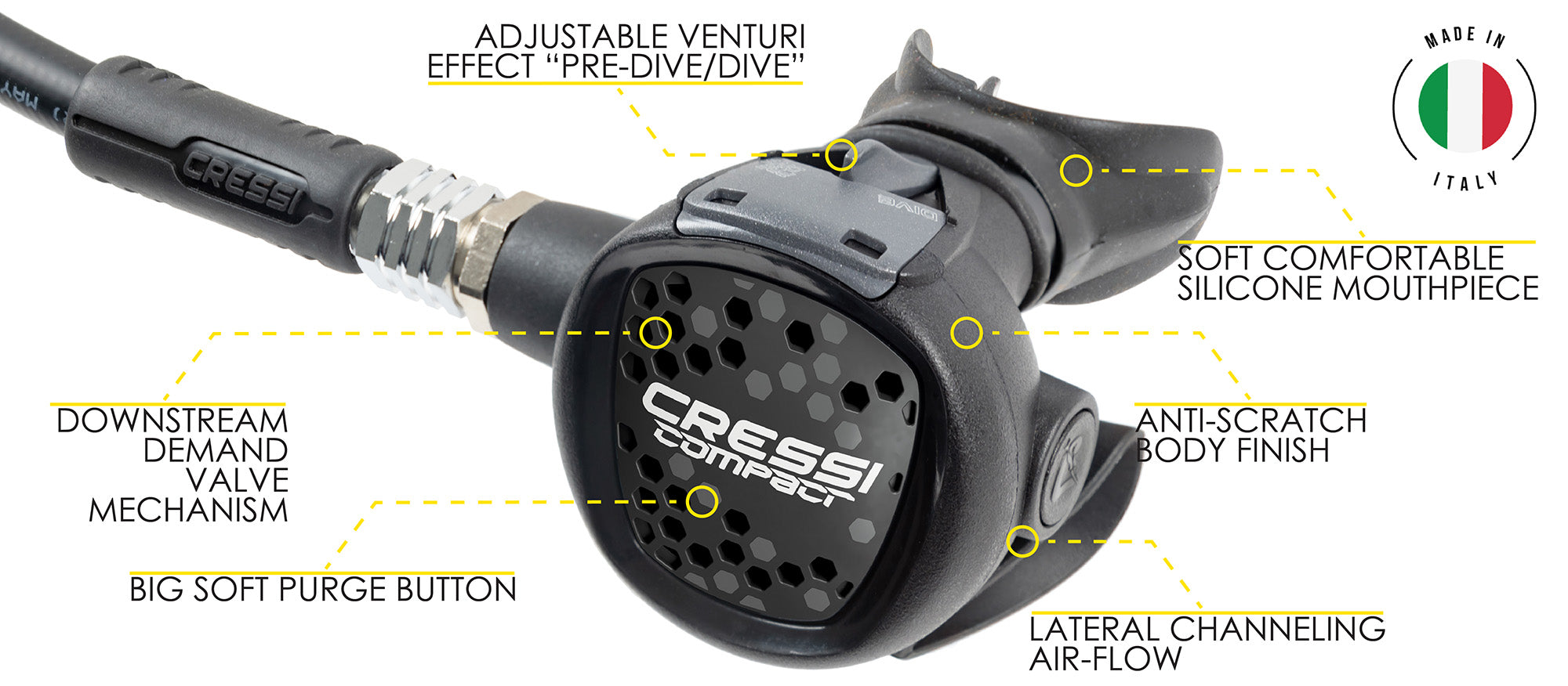 Ideal scuba diving regulator for beginners and travelers. Hyperbalanced membrane 1st stage plus a compact single-hull second stage.