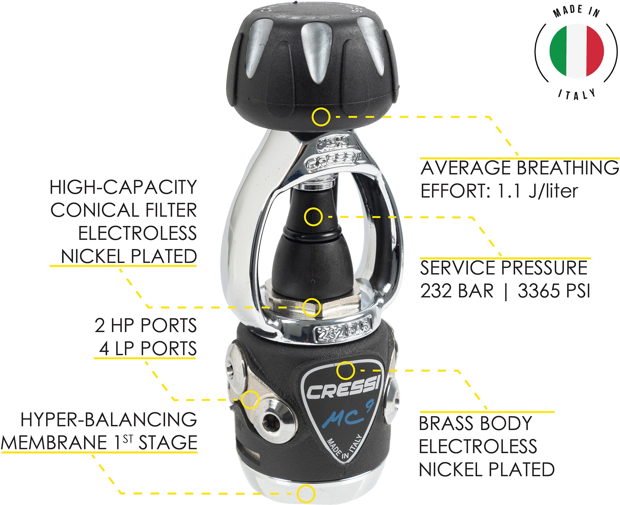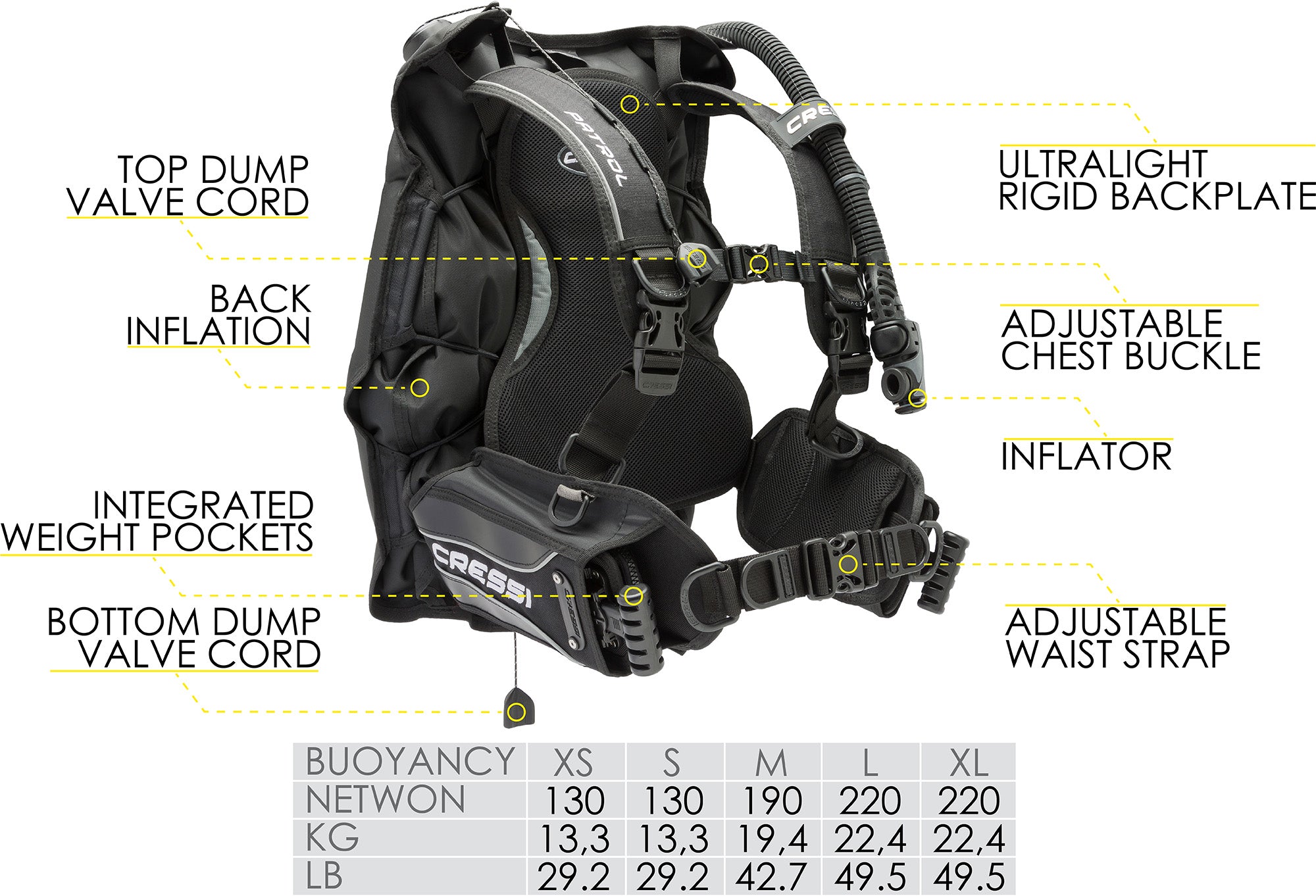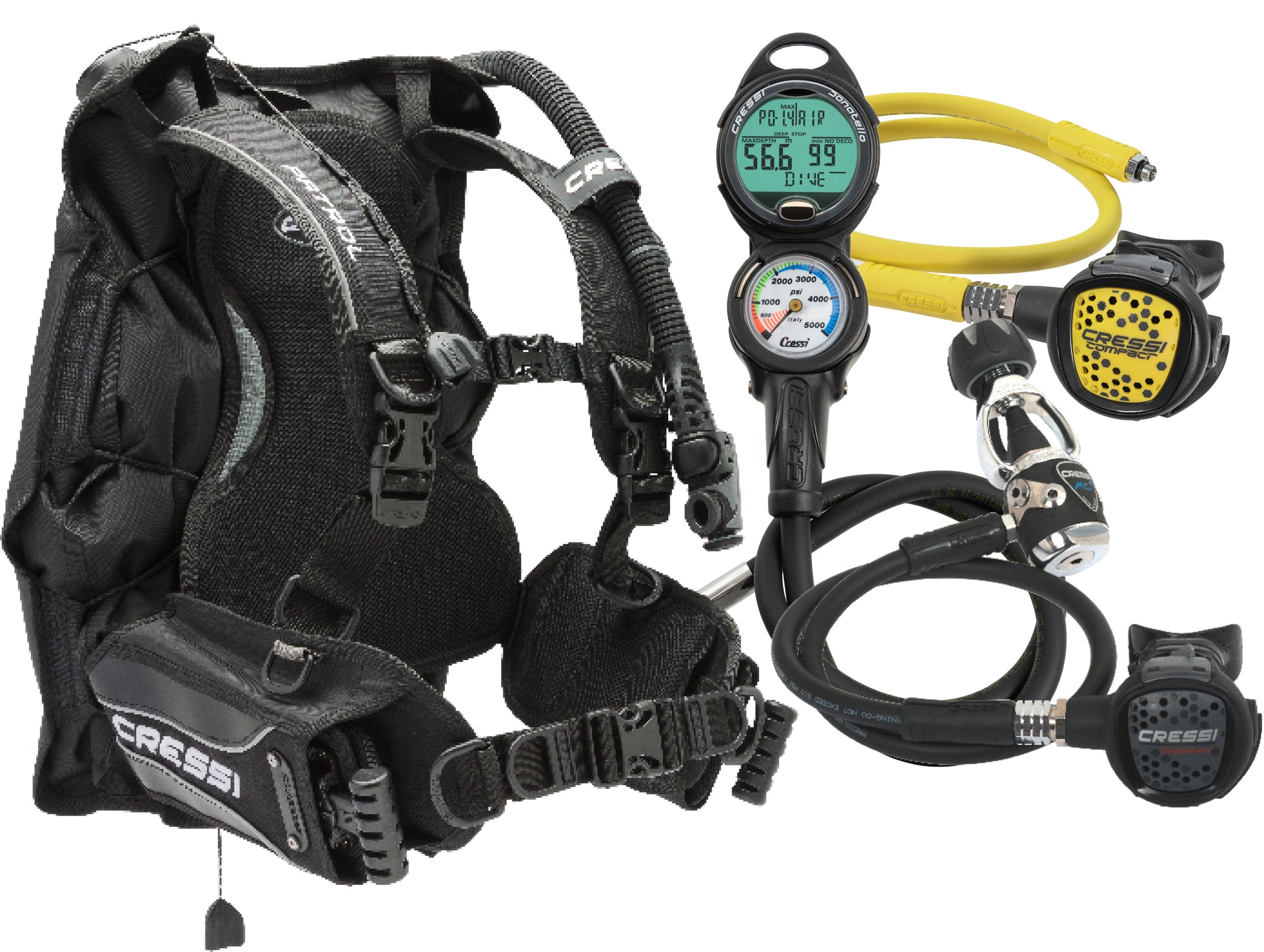 Ideal Scuba Package for diving lovers. The equipment offers everything you need to dive in warm or in temperate waters. The set consists of the Patrol BCD, MC9/Compact regulator, Octopus Compact, and Donatello Console 2. The Patrol is a dorsal volume BCD that is very versatile for all types of diving, with robust but lightweight construction at the same time and a low volume of transport but strong and very flexible. High-lift capacity. Inflator with a double air filtration system; under the hose connection stem and around the valve. The MC9/Compact is the ideal regulator for travelers, light and performant. It features a hyperbalanced membrane that allows for effortless breathing. 2 HP and 4 LP ports available for different uses. The second stage has a compact size and the air exhalation is pushed sideways not obstructing the visibility. The Donatello Console 2 is an essential device for safe diving. It is equipped with the recent Donatello computer, which offers all the information necessary for the dive: depth, dive time, remaining time, and so on. The computer is equipped with the RGBM algorithm which constantly calculates the decompression curve inviting the diver to perform Deep Stops.